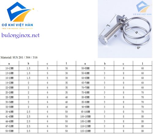 Thông số kỹ thuật đai xiết inox loại dây đôi